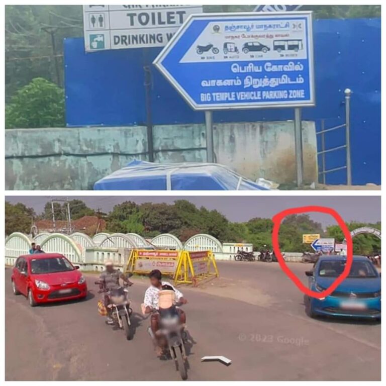 தென்மாவட்டங்கள், கேரளா, கர்நாடகா மாநிலங்களை சேர்ந்தவர்கள் தஞ்சை பெரியகோவிலுக்கு மேம்பாலம் வழியாக வரும் போது தூரத்தில் உள்ள இந்த சிறிய அறிவிப்பு பலகை பலருக்கும் தெரியும்படியாக இல்லாததால் இடது பக்கம் திரும்பி சோழன் சிலை வந்து யு டர்ன் எடுத்து மறுபடி பார்க்கிங் பகுதிக்கு வருகின்றனர்.கொஞ்சம் பெரிதாக மேம்பாலம் இறக்கத்தில் வரும் போதே தெரியும் படியாக வைப்பார்களா தஞ்சை மாநகராட்சி.